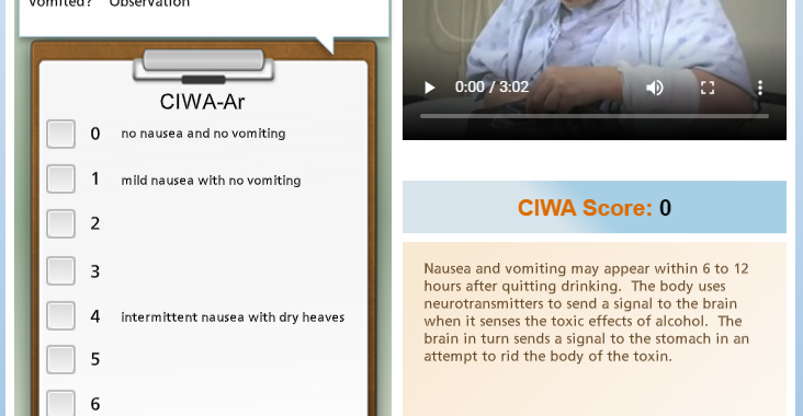 Alcohol WithdrawalElizabeth MilesFeb 27, 20201 min readUpdated: Dec 21, 2022(Articulate Storyline)The CIWA-Ar is a tool used to gauge the symptoms of alcohol withdrawal. In this scenario, students use the tool to assess a patient.