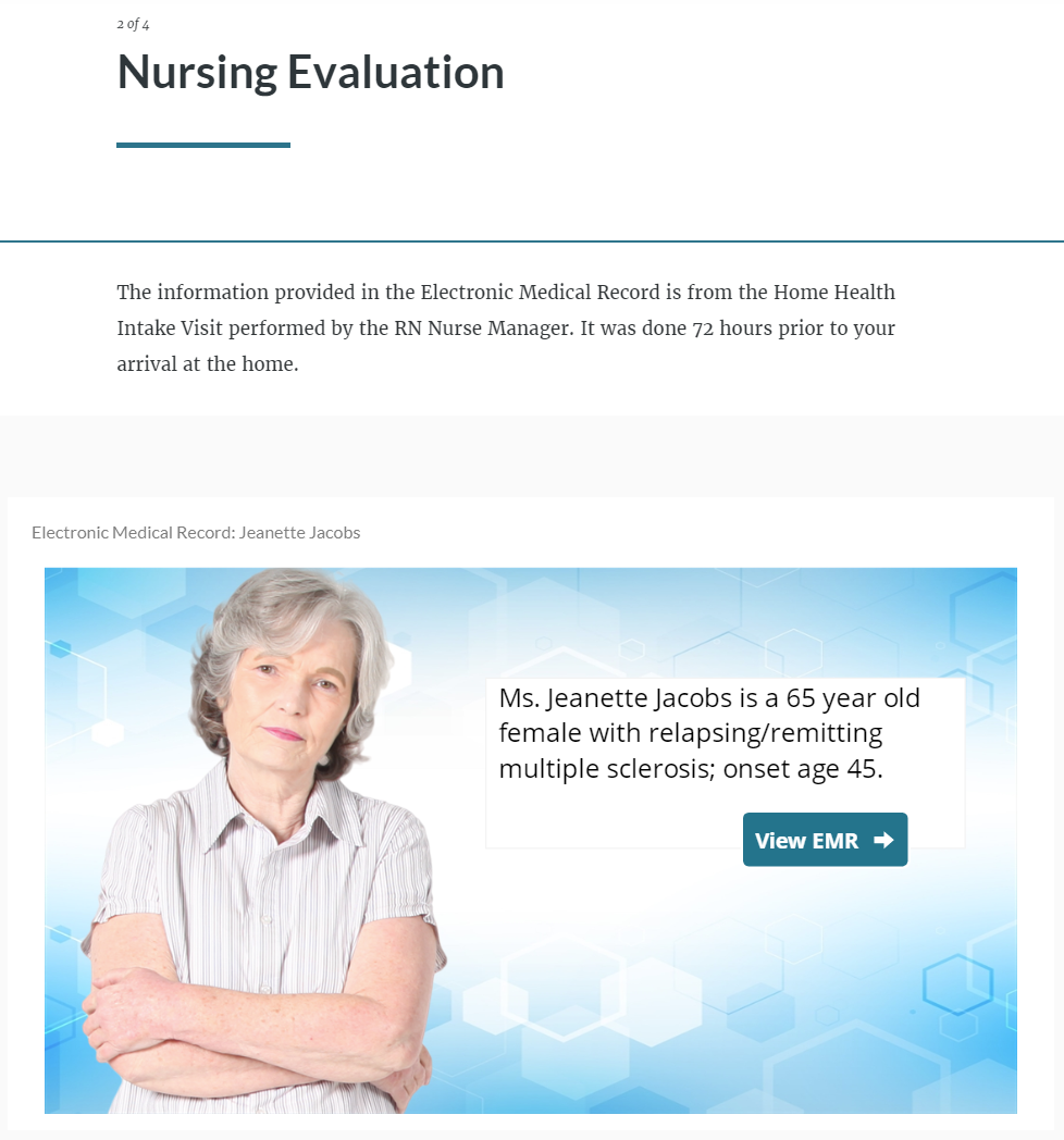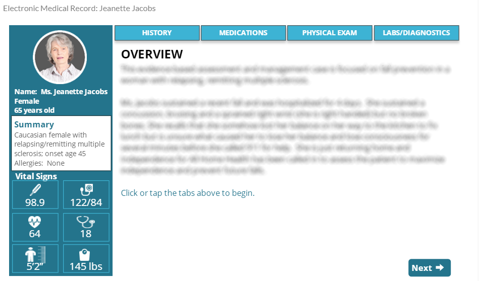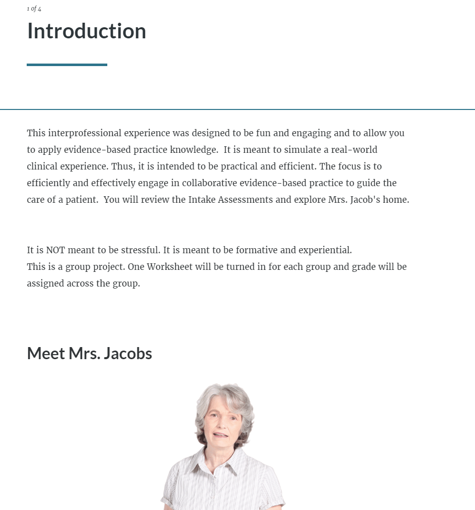 This case was written collaboratively by nursing and occupational therapy instructors. Students stepped through the case in class, which involved reading the patient's electronic medical record (nursing), SOAP note (occupational therapy) and exploring the patient's house. Nursing and Occupational Therapy students worked together outside of class to develop a plan of care for the patient that represented both disciplines.